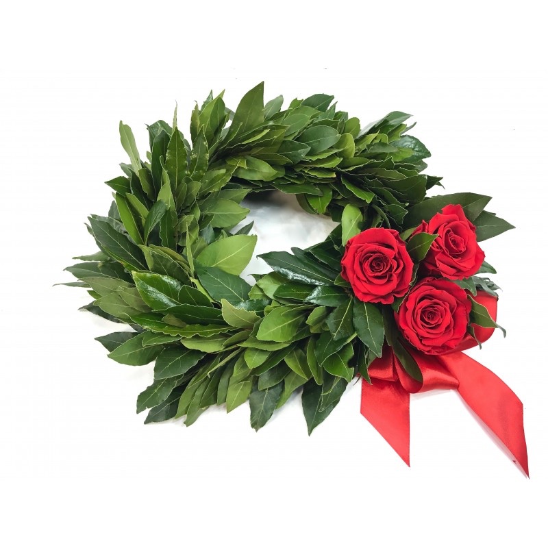 Corona alloro con tre rose sul retro e fiocco.
