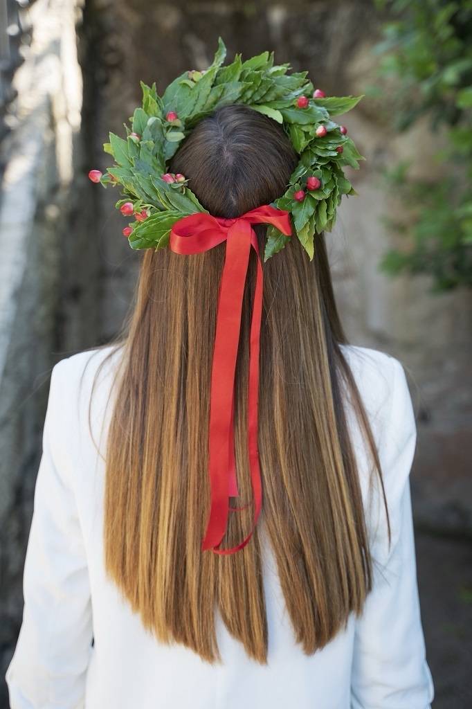 Corona Alloro con Iperico (bacche) e nastro rosso
